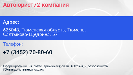 Автоюрист72, компания по адресу 625048, Тюменская область, Тюмень, Салтыкова-Щедрина, 57 в дальнейшем Организация, размещена в следующих категориях: