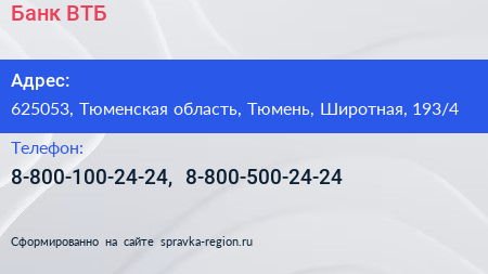 Банк ВТБ по адресу 625053, Тюменская область, Тюмень, Широтная, 193/4 в дальнейшем Организация, размещена в следующих категориях: