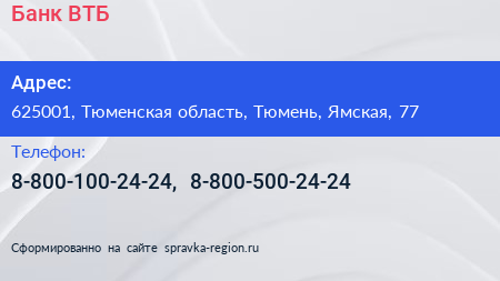Банк ВТБ по адресу 625001, Тюменская область, Тюмень, Ямская, 77 в дальнейшем Организация, размещена в следующих категориях: