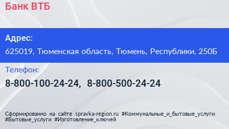 Банк ВТБ по адресу 625019, Тюменская область, Тюмень, Республики, 250Б в дальнейшем Организация, размещена в следующих категориях: