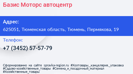 Базис-Моторс, автоцентр по адресу 625051, Тюменская область, Тюмень, Пермякова, 19 в дальнейшем Организация, размещена в следующих категориях: