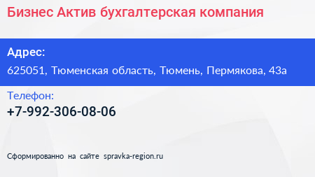 Бизнес Актив, бухгалтерская компания по адресу 625051, Тюменская область, Тюмень, Пермякова, 43а в дальнейшем Организация, размещена в следующих категориях: