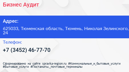 Бизнес-Аудит по адресу 625033, Тюменская область, Тюмень, Николая Зелинского, 24 в дальнейшем Организация, размещена в следующих категориях: