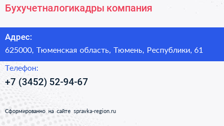 Бухучетналогикадры, компания по адресу 625000, Тюменская область, Тюмень, Республики, 61 в дальнейшем Организация, размещена в следующих категориях: