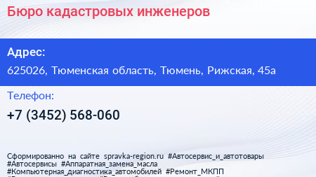 Бюро кадастровых инженеров по адресу 625026, Тюменская область, Тюмень, Рижская, 45а в дальнейшем Организация, размещена в следующих категориях: