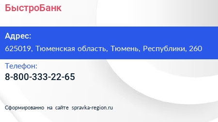 БыстроБанк по адресу 625019, Тюменская область, Тюмень, Республики, 260 в дальнейшем Организация, размещена в следующих категориях: