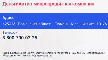 ДеньгиАктив, микрокредитная компания по адресу 625026, Тюменская область, Тюмень, Мельникайте, 101/6 в дальнейшем Организация, размещена в следующих категориях: