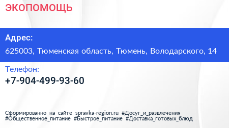 ЭКОПОМОЩЬ по адресу 625003, Тюменская область, Тюмень, Володарского, 14 в дальнейшем Организация, размещена в следующих категориях: