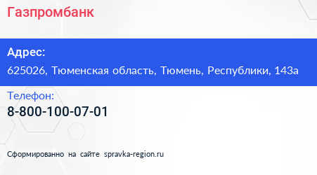 Газпромбанк по адресу 625026, Тюменская область, Тюмень, Республики, 143а в дальнейшем Организация, размещена в следующих категориях: