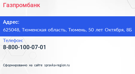 Газпромбанк по адресу 625048, Тюменская область, Тюмень, 50 лет Октября, 8Б в дальнейшем Организация, размещена в следующих категориях: