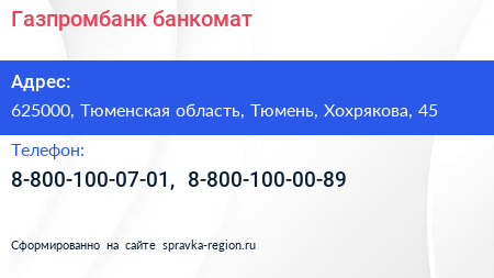 Газпромбанк, банкомат по адресу 625000, Тюменская область, Тюмень, Хохрякова, 45 в дальнейшем Организация, размещена в следующих категориях:
