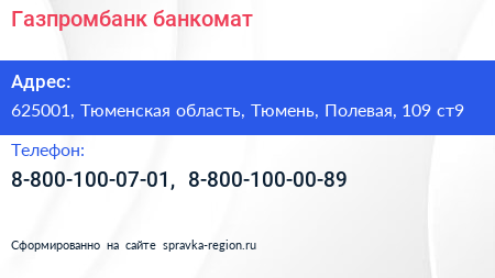 Газпромбанк, банкомат по адресу 625001, Тюменская область, Тюмень, Полевая, 109 ст9 в дальнейшем Организация, размещена в следующих категориях: