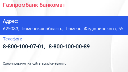 Газпромбанк, банкомат по адресу 625033, Тюменская область, Тюмень, Федюнинского, 55 в дальнейшем Организация, размещена в следующих категориях:
