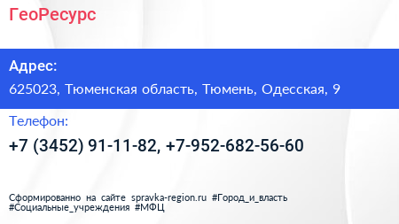 ГеоРесурс по адресу 625023, Тюменская область, Тюмень, Одесская, 9 в дальнейшем Организация, размещена в следующих категориях:
