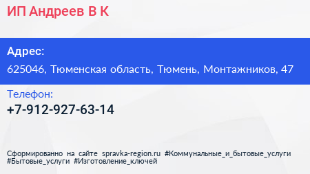 ИП Андреев В.К. по адресу 625046, Тюменская область, Тюмень, Монтажников, 47 в дальнейшем Организация, размещена в следующих категориях: