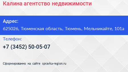 Калина, агентство недвижимости по адресу 625026, Тюменская область, Тюмень, Мельникайте, 101а в дальнейшем Организация, размещена в следующих категориях: