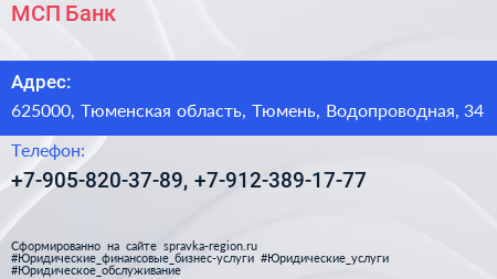 МСП Банк по адресу 625000, Тюменская область, Тюмень, Водопроводная, 34 в дальнейшем Организация, размещена в следующих категориях: