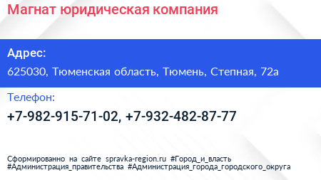 Магнат, юридическая компания по адресу 625030, Тюменская область, Тюмень, Степная, 72а в дальнейшем Организация, размещена в следующих категориях: