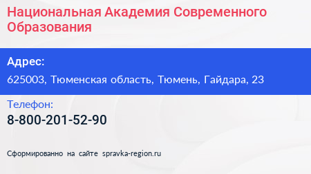 Национальная Академия Современного Образования по адресу 625003, Тюменская область, Тюмень, Гайдара, 23 в дальнейшем Организация, размещена в следующих категориях: