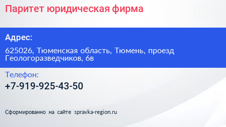 Паритет, юридическая фирма по адресу 625026, Тюменская область, Тюмень, проезд Геологоразведчиков, 6в в дальнейшем Организация, размещена в следующих категориях: