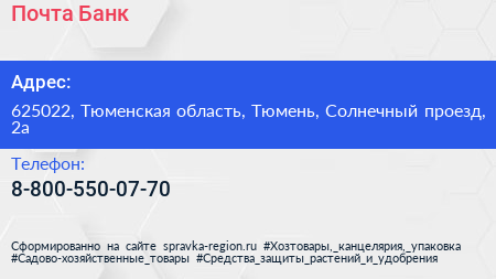 Почта Банк по адресу 625022, Тюменская область, Тюмень, Солнечный проезд, 2а в дальнейшем Организация, размещена в следующих категориях: