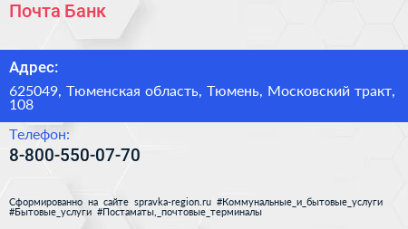 Почта Банк по адресу 625049, Тюменская область, Тюмень, Московский тракт, 108 в дальнейшем Организация, размещена в следующих категориях: