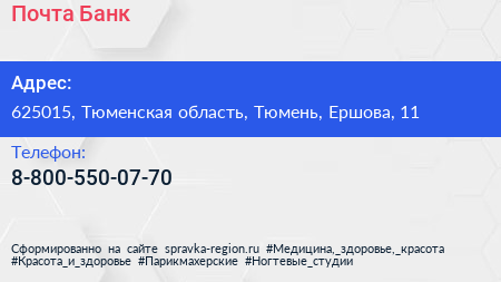 Почта Банк по адресу 625015, Тюменская область, Тюмень, Ершова, 11 в дальнейшем Организация, размещена в следующих категориях: