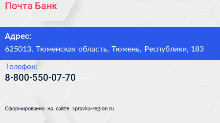 Почта Банк по адресу 625013, Тюменская область, Тюмень, Республики, 183 в дальнейшем Организация, размещена в следующих категориях: