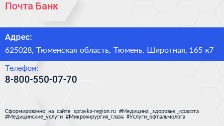 Почта Банк по адресу 625028, Тюменская область, Тюмень, Широтная, 165 к7 в дальнейшем Организация, размещена в следующих категориях: