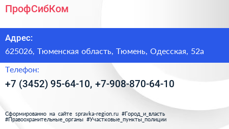 ПрофСибКом по адресу 625026, Тюменская область, Тюмень, Одесская, 52а в дальнейшем Организация, размещена в следующих категориях: