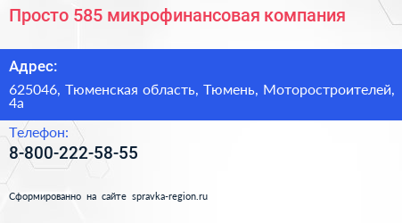 Просто 585, микрофинансовая компания по адресу 625046, Тюменская область, Тюмень, Моторостроителей, 4а в дальнейшем Организация, размещена в следующих категориях: