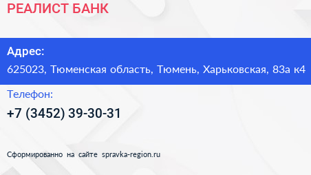 РЕАЛИСТ БАНК по адресу 625023, Тюменская область, Тюмень, Харьковская, 83а к4 в дальнейшем Организация, размещена в следующих категориях: