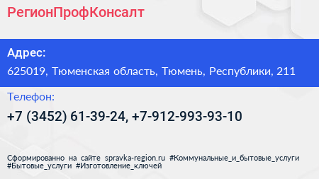 РегионПрофКонсалт по адресу 625019, Тюменская область, Тюмень, Республики, 211 в дальнейшем Организация, размещена в следующих категориях: