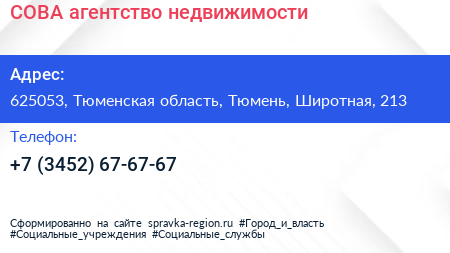 СОВА, агентство недвижимости по адресу 625053, Тюменская область, Тюмень, Широтная, 213 в дальнейшем Организация, размещена в следующих категориях: