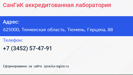 СанГиК, аккредитованная лаборатория по адресу 625000, Тюменская область, Тюмень, Герцена, 88 в дальнейшем Организация, размещена в следующих категориях: