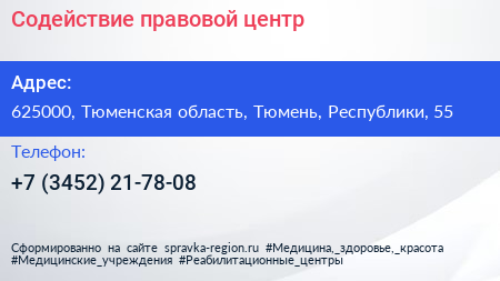 Содействие, правовой центр по адресу 625000, Тюменская область, Тюмень, Республики, 55 в дальнейшем Организация, размещена в следующих категориях: