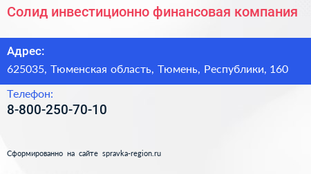 Солид, инвестиционно-финансовая компания по адресу 625035, Тюменская область, Тюмень, Республики, 160 в дальнейшем Организация, размещена в следующих категориях: