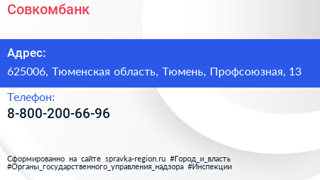 Совкомбанк по адресу 625006, Тюменская область, Тюмень, Профсоюзная, 13 в дальнейшем Организация, размещена в следующих категориях: