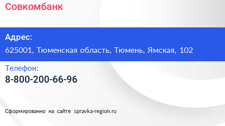 Совкомбанк по адресу 625001, Тюменская область, Тюмень, Ямская, 102 в дальнейшем Организация, размещена в следующих категориях: