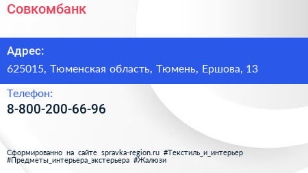 Совкомбанк по адресу 625015, Тюменская область, Тюмень, Ершова, 13 в дальнейшем Организация, размещена в следующих категориях: