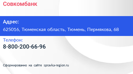 Совкомбанк по адресу 625016, Тюменская область, Тюмень, Пермякова, 68 в дальнейшем Организация, размещена в следующих категориях: