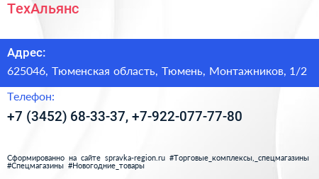 ТехАльянс по адресу 625046, Тюменская область, Тюмень, Монтажников, 1/2 в дальнейшем Организация, размещена в следующих категориях: