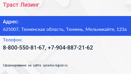 Траст Лизинг по адресу 625007, Тюменская область, Тюмень, Мельникайте, 123а в дальнейшем Организация, размещена в следующих категориях: