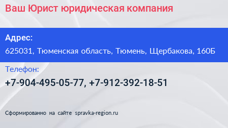 Ваш Юрист, юридическая компания по адресу 625031, Тюменская область, Тюмень, Щербакова, 160Б в дальнейшем Организация, размещена в следующих категориях: