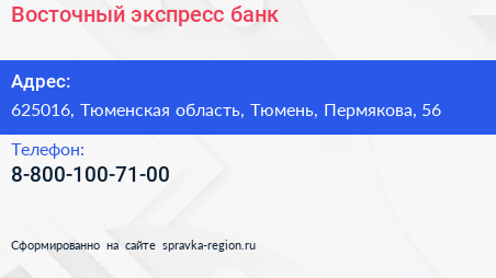 Восточный экспресс банк по адресу 625016, Тюменская область, Тюмень, Пермякова, 56 в дальнейшем Организация, размещена в следующих категориях: