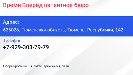 Время Вперёд, патентное бюро по адресу 625026, Тюменская область, Тюмень, Республики, 142 в дальнейшем Организация, размещена в следующих категориях: