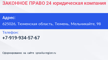 ЗАКОННОЕ ПРАВО-24, юридическая компания по адресу 625026, Тюменская область, Тюмень, Мельникайте, 98 в дальнейшем Организация, размещена в следующих категориях:
