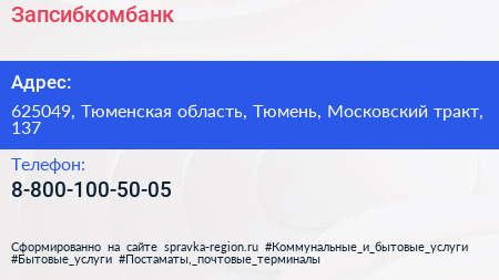 Запсибкомбанк по адресу 625049, Тюменская область, Тюмень, Московский тракт, 137 в дальнейшем Организация, размещена в следующих категориях:
