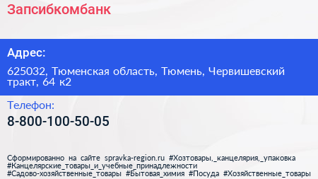 Запсибкомбанк по адресу 625032, Тюменская область, Тюмень, Червишевский тракт, 64 к2 в дальнейшем Организация, размещена в следующих категориях: