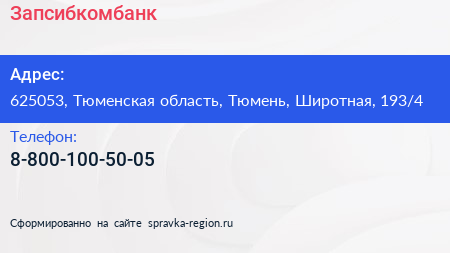 Запсибкомбанк по адресу 625053, Тюменская область, Тюмень, Широтная, 193/4 в дальнейшем Организация, размещена в следующих категориях: